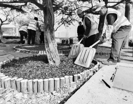 为推动园林养护管理工作向绿色低碳环保方向发展,市园林环卫服务中心探索园林绿化废弃物循环再利用,把园林绿化废弃物处置与精细化管理结合起来,在园林广场、口袋公园林下空间等各种地表裸露地铺设彩色有机覆盖物,进一步提升园区景观,促进文明城市创建。图为绿化工人将破碎染色后的枯枝铺设到造型好的裸露地面上。 杜文娟摄