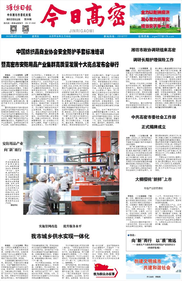 本报讯 (记者杜文娟 通讯员窦桂萍)4月9日上午,中国纺织品商业协会安全防护手套标准培训暨高密市安防用品产业集群高质量发展十大亮点发布会在高密举行。会上,发布了“创新驱动,新质生产力让老产业焕发新活力”“数转智改,激活发展新动能”等10项高密市安防用品产业集群高质量发展亮点。
