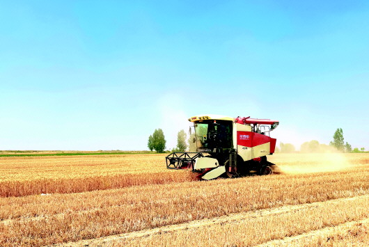 图1:山东天凯中锐公司试验工程师开着全新改款升级的圣春雨纵轴流小麦联合收割机收割小麦。 张海燕摄
