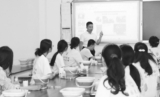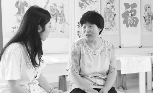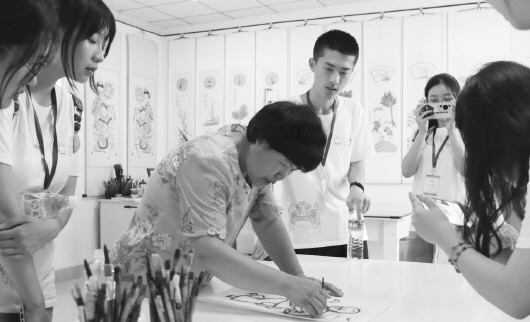 只见王老师拿起一根细细的碳条,在熟宣纸上轻轻描画,将其翻盖在另一张干净的宣纸上,指导一小队成员用双手按压表层纸,当再次掀起时,就得到了两张镜面对称的图画。王老师解释道,这样的绘制方法也适应民间年画成双成对的风俗文化,这也要求画家在构思时提前想象出其镜像。