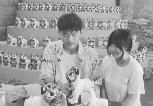 在了解泥老虎的制作步骤后,小队成员也迫不及待拿起画笔为面前的泥老虎胚着色。与此同时,小队成员梁睿、潘梦达对聂老师进行问题专访,就聂家庄泥塑的独特之处、工艺发展、传承初衷等问题进行交流。