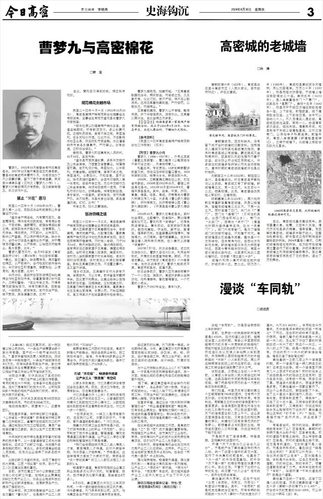 曹梦九,1935年10月接替余有林任高密县长,1937年12月离开高密返回天津老家。曹县长牧高密两年零两个月,为老百姓办了不少实事好事,留下了若干奇闻逸事,民间至今津津乐道(见附文《曹梦九小传》)。曹梦九对高密棉花亦有贡献,但文献鲜有提及,本文试作补白。