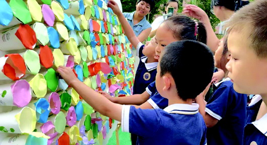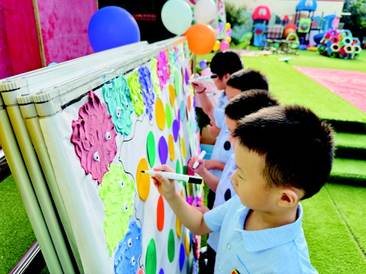 图⑷:机关幼儿园的孩子们用画笔将自己可爱的笑脸留在表情墙上。 荆文玲摄