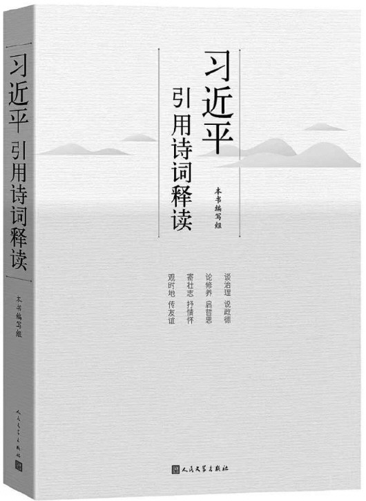 今年是习近平总书记在文艺工作座谈会发表重要讲话十周年,在文化传承发展座谈会发表重要讲话一周年。《习近平引用诗词释读》一书近期由人民文学出版社出版发行。该书遴选了党的十八大到党的二十大期间,习近平总书记重要讲话及文章中引用的99则诗词名句,并辅以“延伸阅读”和“诗词释义”,阐释诗词的背景义理和现实意义,是总书记在文化传承发展座谈会讲话后摘编总书记引用诗词并作深入阐释的著作。
