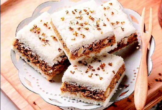 ◆桂花糕/桂花糯米酒/桂花赤豆小圆子 在秋天的饭桌上桂花也是不可或缺的食材。来一碗热腾腾的桂花赤豆小圆子,和三五好友小酌一杯桂花糯米酒,饭后再来两块桂花糕,每一口都唇齿留香,回味悠长。