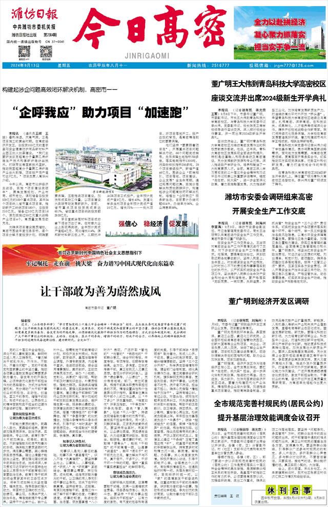 近日,《山东领导科学》“学习贯彻党的二十届三中全会精神·干部担当”栏目,在头版头条刊发高密市委书记董广明题为《让干部敢为善为蔚然成风》的署名文章。文章表示,党的干部是党和国家事业的中坚力量,推动各项事业蓬勃发展迫切需要更多敢为善为、奋发有为的开路先锋,必须持续优化激励干部担当作为的思路理念、方式方法和制度机制,充分调动广大干部干事创业的积极性、主动性、创造性,匡正干的导向、增强干的动力、形成干的合力,以昂扬向上的精神面貌和实干担当的过硬作风奋进新征程、建功新时代。全文如下: