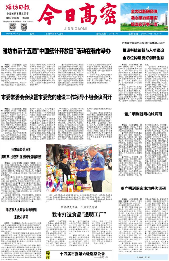本报讯 (记者祝有凯 张丽华 刘海州)9月21日,市委常委会会议暨市委党的建设工作领导小组会议召开,传达学习习近平总书记对党纪学习教育作出的重要指示,以及中央和省委、潍坊市委有关会议精神,对全市党纪学习教育进行总结,推动党的纪律教育常态化长效化。市委书记、市委党的建设工作领导小组组长董广明主持并讲话,市级有关领导和市委党的建设工作领导小组成员参加。