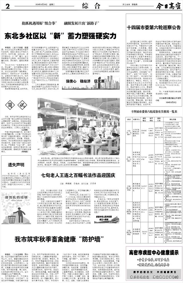 董广明强调,阚家镇、注沟社区、井沟镇经济基础扎实、自然禀赋优良、发展潜力充足,要进一步明晰定位、完善思路,解放思想、改革创新,推动镇域各项事业高质量发展。要精准服务企业项目,落实落细惠企纾困政策,高质高效推进项目建设,更大力度开展招大引强,加快培育壮大新质生产力,不断塑造发展新动能、新优势。要着力打造品牌农业,发展品质优、效益好的种植养殖新品种,拓展农产品精深加工,深化农文旅融合发展,推动农业全链条升级、多元化发展。要深挖盘活资产资源,大力实施市场化运营,积极导入新业态和新产业,努力把存量资源转化为优质增量。要加强生态环保治理,深入实施城乡环卫一体化,协同推进降碳、减污、扩绿、增长,持续改善生态环境质量。要加强和创新基层社会治理,深化矛盾纠纷排查化解,坚持不懈抓好安全生产,守牢社会治安、耕地保护等一排底线。要深化能力作风建设,树立重实干、重实绩鲜明导向,广泛开展亮绩晒绩擂台比武活动,激励干部担当作为、奋勇争先,为高密率先崛起作出更大贡献。