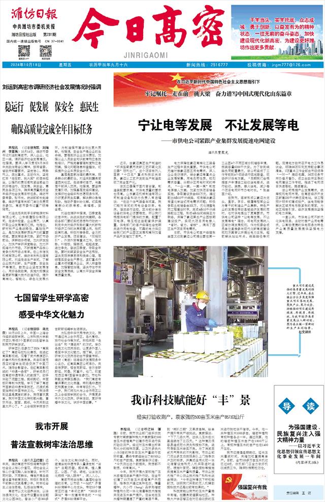 本报讯 (记者祝有凯 刘海州 李重禹)10月14日,潍坊市委书记刘运到高密市,深入企业、社区一线,调研经济社会发展情况。他强调,要深入学习贯彻9月26日中央政治局会议精神,按照省委、省政府部署要求,坚定信心、乘势而上,突出重点、主动作为,坚定扛牢“走在前、挑大梁”的使命担当,以强烈的责任感和紧迫感全力抓好稳运行、促发展、保安全、惠民生各项工作,确保高质量完成全年经济社会发展目标任务。潍坊市委常委、秘书长、统战部部长赵绪春,潍坊市直有关部门单位负责同志参加,高密市委书记董广明等陪同。