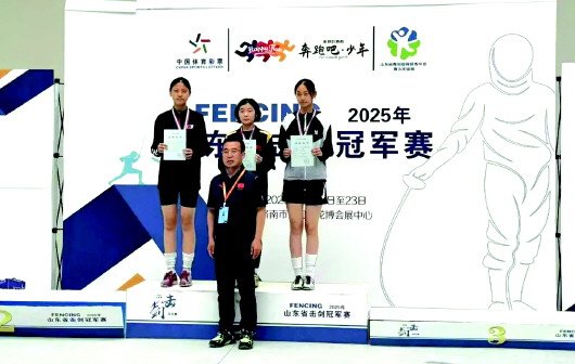 近日,“中国体育彩票杯”2025年山东省击剑冠军赛在济南商河举办,来自全省13个地市的644名青少年击剑选手参赛。我市输送运动员潘妙涵(领奖台上左起第二位为潘妙涵)作为潍坊代表队的成员参赛,凭借场上出色发挥获得U14女子重剑个人第一名。据高密体育