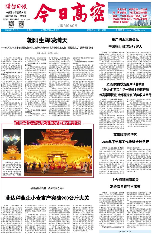 本报讯 (记者杜文娟 孙庆涛)7月12日晚,2025潍坊市文旅夏季消费季暨“潍你好”惠民生活一码通上线运行和红高粱影视城“欢乐星光夜”启动仪式举行,潍坊市文化和旅游局党组成员、齐鲁文化(潍坊)生态保护区服务中心主任宿立军,高密市委副书记、市长王大伟出席活动并分别致辞,有关市领导参加活动。