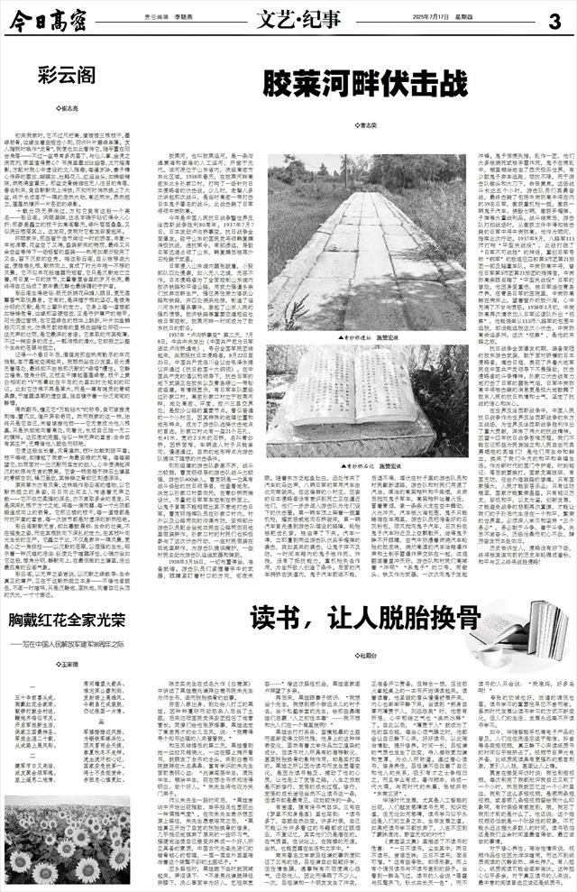 胶莱河,也叫胶莱运河,是一条沟通黄海和渤海的人工运河,开凿于元代。该河流位于山东省内,流经高密市东北区域。1938年春天,在胶莱河畔高密东北乡孙家口村,打响了一场针对日本侵略者的伏击战。少儿时,老辈人多次讲起那次战斗,是当时高密一带打击日本鬼子著名的战斗,此战击毙了日军将领中岗弥高。
