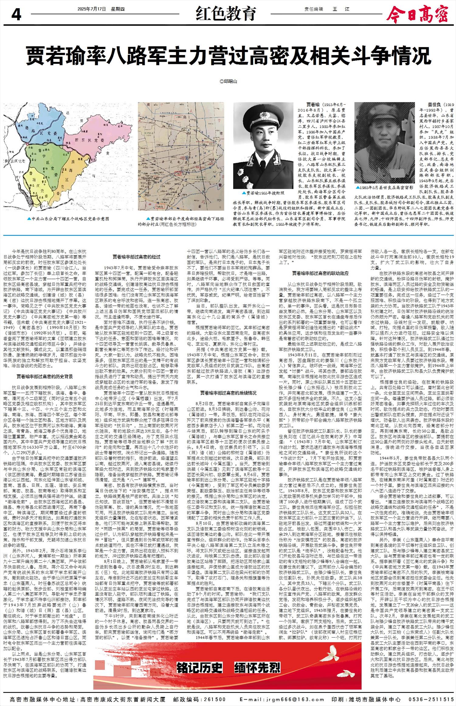 另据《中共高密地方史第一卷》载,1943年7月中旬,根据山东军区命令,胶东军区参谋长贾若瑜率十四团一营和抽调部分党政军人员组成的抗日武装工作队,由高密东部越过胶济铁路进入诸胶(高)边游击区,第一次打通了胶东区与滨海区的直接联系。