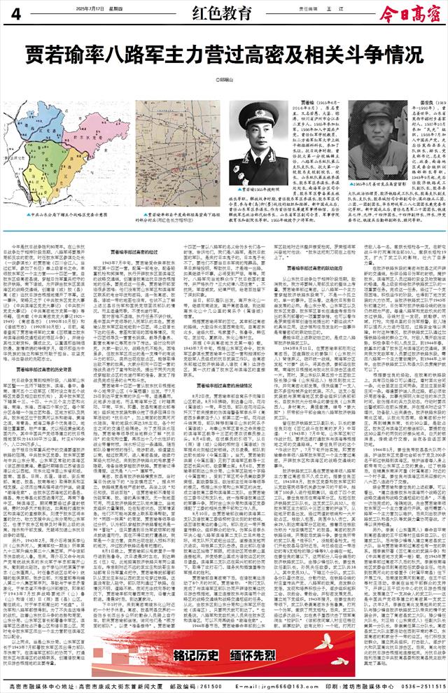 铭记历史 缅怀先烈   今年是抗日战争胜利80周年。在山东抗日战争处于相持阶段后期、八路军将要展开局部反攻的前夜,时任胶东军区参谋处处长(一说参谋长)的贾若瑜(四川合江人,当过红军,参加了长征)奉上级首长之命,率领胶东军区一个主力营——十四团一营,自胶东区经高密县境,穿越日伪军重兵把守的胶济铁路,南下诸城,为开辟由胶东区至滨海区的战略交通线,创建诸(城)胶(县)高(密)边抗日游击根据地揭开了序幕。这一事件,简略见之于《中共胶东区党史大事记》《中共滨海区党史大事记》《中共胶州党史大事记》《中共高密地方史第一卷》等书籍,但未载《中共高密党史大事记1921-1949》《高密县志》(1990年10月版)和《诸城市志》(1992年10月版)。日前,笔者查阅了贾若瑜将军的文章《回顾建立胶东与滨海战略交通枢纽的艰巨斗争》,并结合其他文献资料,撰成此文,以重温那些硝烟弥漫、激情燃烧的峥嵘岁月,缅怀那些为中华民族的独立和解放而敢于担当、攻坚克难、浴血奋战的先驱志士。