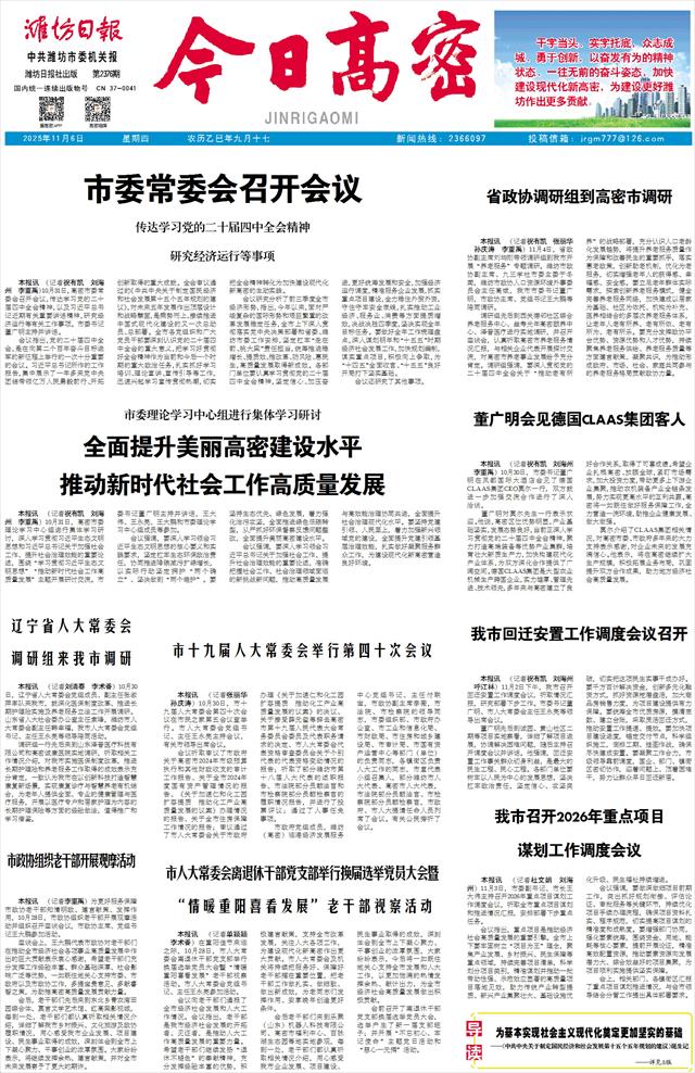 董广明对莫尔先生一行表示欢迎。他说,高密区位优势明显,产业基础坚实,发展态势良好,当前正深入学习贯彻党的二十届四中全会精神,聚力打造高端装备等优势产业集群,培育壮大新质生产力,加快构建现代化产业体系,为双方深化合作提供了广阔空间。德国CLAAS集团是大型农业机械生产跨国企业,实力雄厚、管理先进、技术领先,多年来与高密建立了良好合作关系,取得了可喜成绩。希望企业扎根高密、放眼全球,紧盯市场需求,加大投资力度,带动更多上下游企业集聚,推动农机装备产业全链条发展,努力实现更高水平的互利共赢。高密将一如既往做好服务保障工作,全力营造一流环境,助推企业健康发展、做大做强。