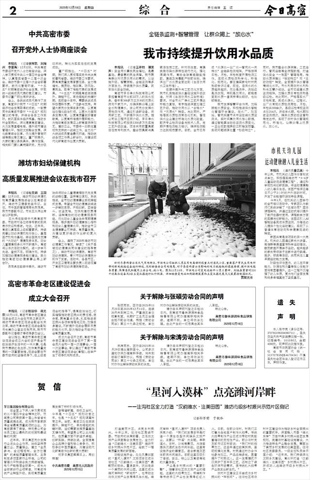 全链条监测+智慧管理 让群众喝上“放心水” 我市持续提升饮用水品质   本报讯 (记者王择钧 谭美芹)安全用水事关民生福祉,是最基础、最普惠的民生保障。我市聚焦群众对优质饮用水的需求,从设施升级、智慧赋能、全链监测等多方面发力,持续提升供水质量,筑牢供水安全防线。