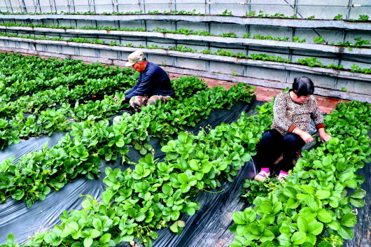 ●冬至节气,我市各镇街区的农民抢抓农时开展农事活动。图为醴泉街道东尤家屯村的草莓种植户在大棚内疏花的场景。 李海涛摄