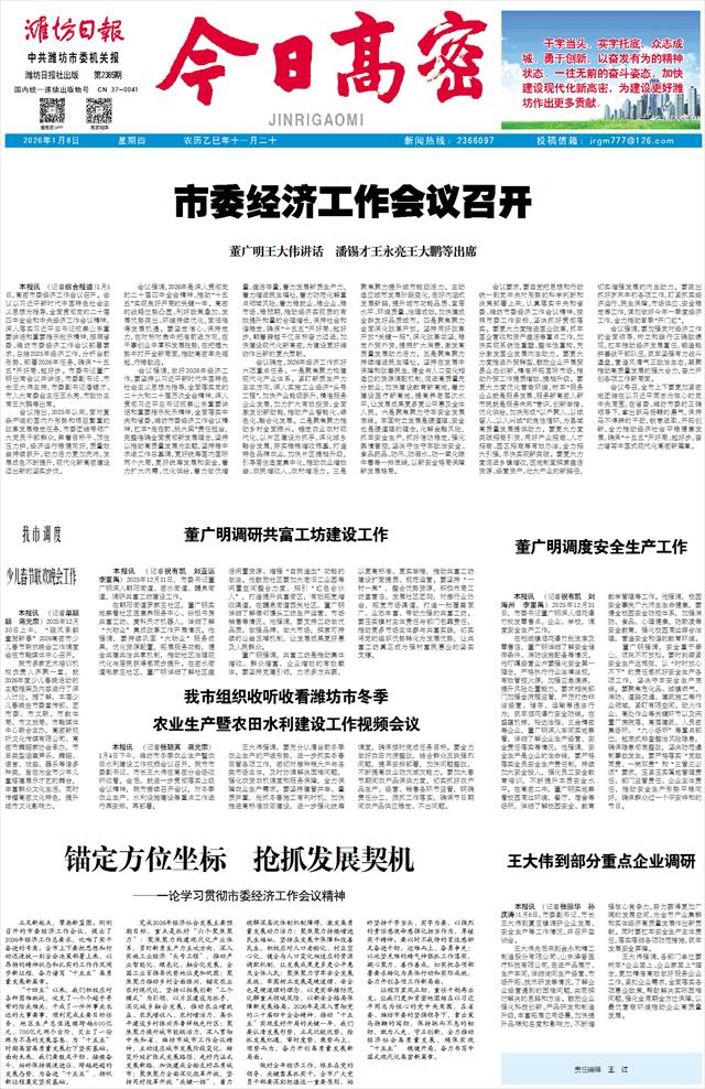 市委经济工作会议召开 董广明王大伟讲话 潘锡才王永亮王大鹏等出席   本报讯 (记者综合报道)1月5日,高密市委经济工作会议召开。会议以习近平新时代中国特色社会主义思想为指导,全面贯彻党的二十届四中全会和中央经济工作会议精神,深入落实习近平总书记视察山东重要讲话和重要指示批示精神,按照省委、潍坊市委经济工作会议部署要求,总结2025年经济工作,分析当前形势,部署2026年任务,确保“十五五”开好局、起好步。市委书记董广明出席会议并讲话,市委副书记、市长王大伟主持,市委副书记潘锡才、市人大常委会主任王永亮、市政协主席王大鹏等出席。