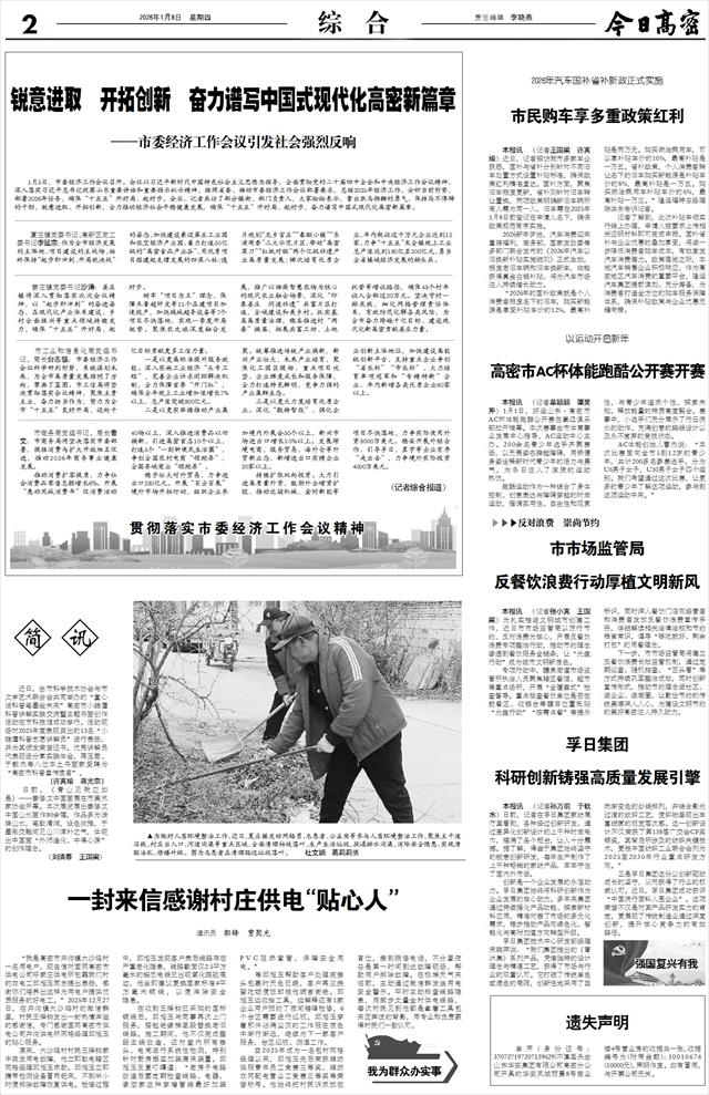 锐意进取 开拓创新 奋力谱写中国式现代化高密新篇章 ——市委经济工作会议引发社会强烈反响   1月5日,市委经济工作会议召开。会议以习近平新时代中国特色社会主义思想为指导,全面贯彻党的二十届四中全会和中央经济工作会议精神,深入落实习近平总书记视察山东重要讲话和重要指示批示精神,按照省委、潍坊市委经济工作会议部署要求,总结2025年经济工作,分析当前形势,部署2026年任务,确保“十五五”开好局、起好步。会后,记者采访了部分镇街、部门负责人,大家纷纷表示,拿出跃马扬鞭的勇气,保持马不停蹄的干劲,锐意进取、开拓创新,全力推动经济社会平稳健康发展,确保“十五五”开好局、起好步,奋力谱写中国式现代化高密新篇章。