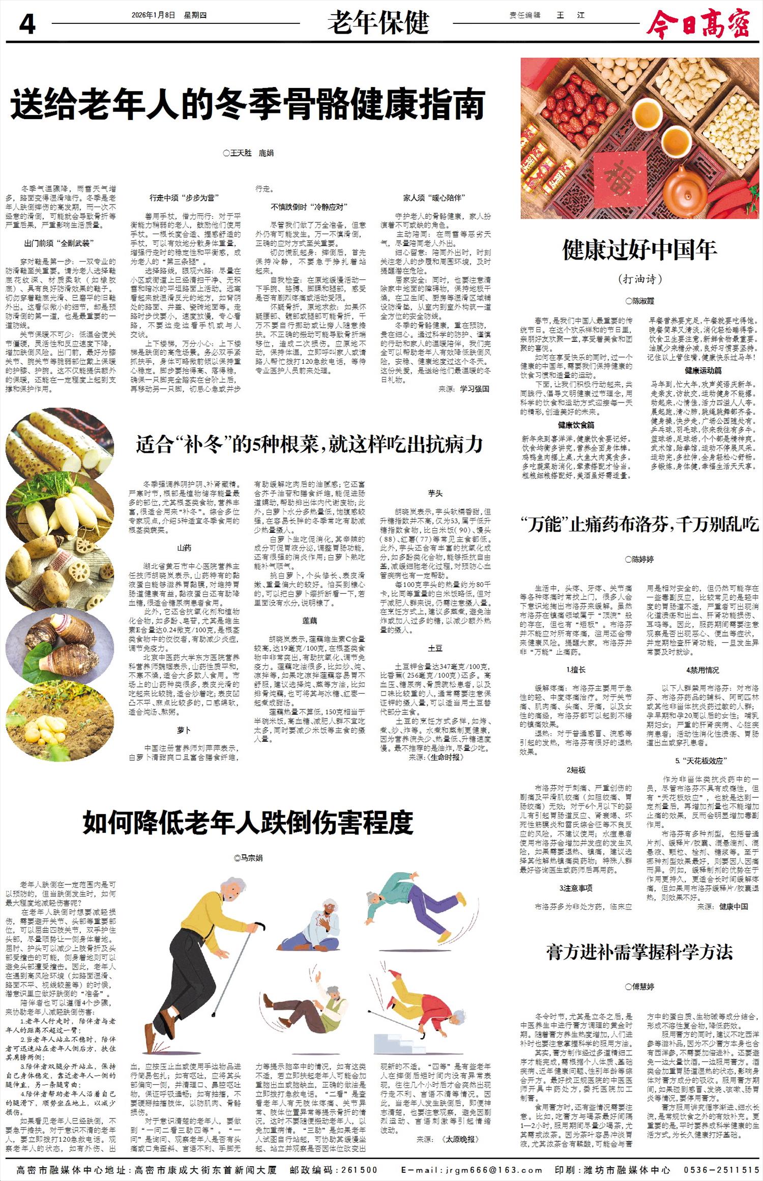 送给老年人的冬季骨骼健康指南○王天胜 鹿娟   冬季气温骤降,雨雪天气增多,路面变得湿滑难行。冬季是老年人跌倒摔伤的高发期,而一次不经意的滑倒,可能就会导致骨折等严重后果,严重影响生活质量。