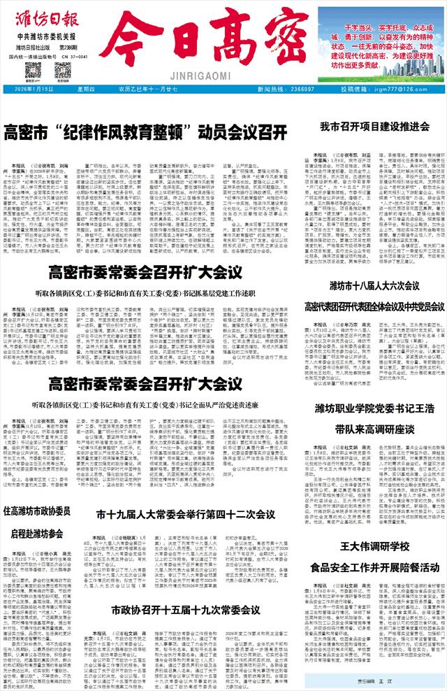 本报讯 (记者祝有凯 刘海州 李重禹)在2026年新年伊始、“十五五”开局之际,1月8日,高密市召开“纪律作风教育整顿”动员会议,深入学习贯彻党的二十届四中全会精神,全面落实党中央和省、潍坊市关于深化作风建设的部署要求,动员全市上下以“纪律作风教育整顿”为抓手,真正把严的氛围营造起来、把正的风气树立起来,推动广大党员干部切实讲政治、强党性、行大道,为全市经济社会高质量发展提供坚强保障。市委书记董广明出席会议并讲话,市委副书记、市长王大伟,市委副书记潘锡才,市人大常委会主任王永亮,市政协主席王大鹏等出席。