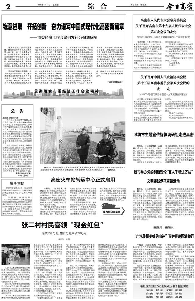 孚日集团董事长张国华:作为全市重点骨干企业,我们孚日集团将全面贯彻市委经济工作会议精神,坚定发展信心,扛牢“走在前、挑大梁”责任担当。我们将聚焦构建现代化产业体系,以发展新质生产力为主攻方向,加大科技创新投入,推动家纺主业智能化、绿色化升级,加快培育新兴产业动能。积极融入全市工业经济“头号工程”,持续扩大有效投资,深化技术改造与数字转型,增强核心竞争力。同时,主动服务乡村振兴与城市发展大局,践行社会责任,保障就业民生,守牢安全环保底线。我们将以更高站位、更实举措,为高密实现“十五五”良好开局、跨越千亿目标贡献孚日力量,奋力谱写高质量发展新篇章。