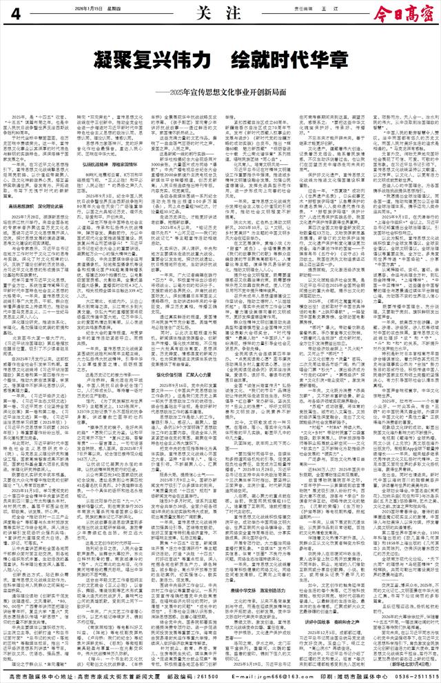 面向未来,在以习近平同志为核心的党中央坚强领导下,在习近平文化思想科学指引下,肩负激发全民族文化创新创造活力的重大使命,宣传思想文化战线实干担当、笃行不怠,以更加昂扬的姿态迈上新的征程。    (新华社北京1月4日电)