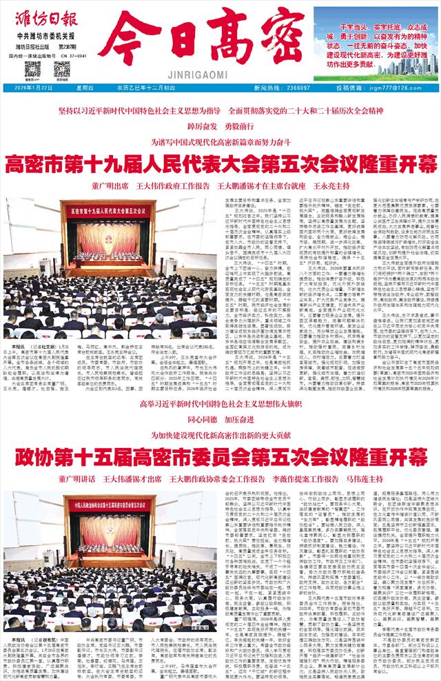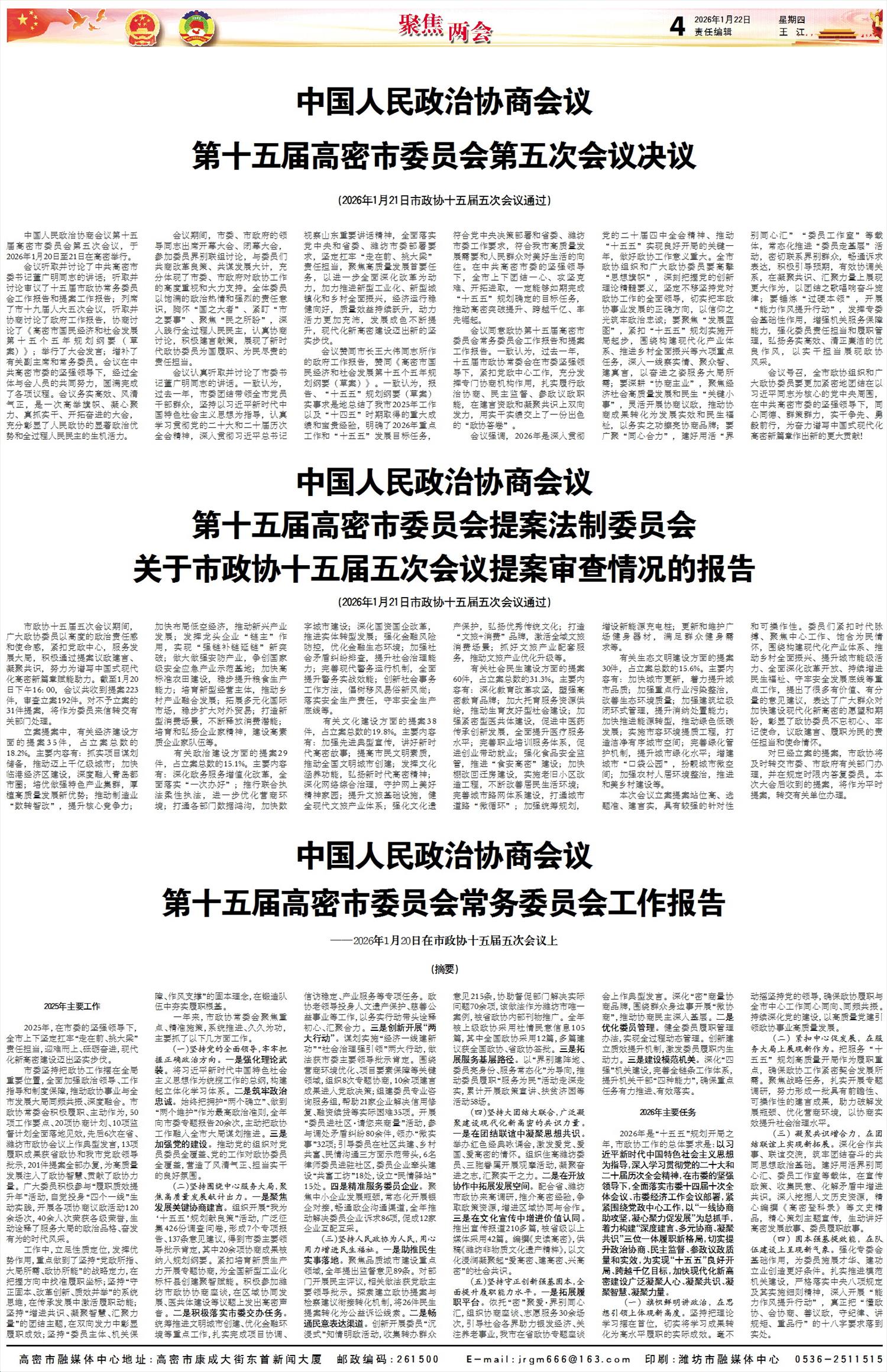 会议赞同市长王大伟同志所作的政府工作报告,赞同《高密市国民经济和社会发展第十五个五年规划纲要(草案)》。一致认为,报告、“十五五”规划纲要(草案)实事求是地总结了我市2025年工作以及“十四五”时期取得的重大成绩和宝贵经验,明确了2026年重点工作和“十五五”发展目标任务,符合党中央决策部署和省委、潍坊市委工作要求,符合我市高质量发展需要和人民群众对美好生活的向往。在中共高密市委的坚强领导下,全市上下团结一心、攻坚克难、开拓进取,一定能够如期完成“十五五”规划确定的目标任务,推动高密突破提升、跨越千亿、率先崛起。