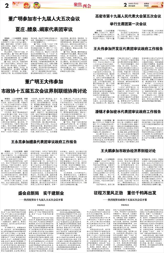 本报讯 (记者刘清春 韩硕 蒋光宗 牟乃宗)1月21日上午,参加市政协十五届五次会议的委员们分组协商讨论政府工作报告。在各分组讨论会场,委员们紧密结合工作实际,各抒己见,畅所欲言,气氛热烈。大家一致认为,报告总结工作求真务实、客观全面,部署2026年任务重点突出、措施精准,紧跟时代步伐,擘画出高密高质量发展的蓝图。2026年是“十五五”规划开局之年,也是高密抢抓机遇、乘势而上的关键之年。委员们纷纷表示,在今后的工作中要立足各自岗位,继承和发扬人民政协光荣传统,进一步提振士气、鼓足干劲,围绕中心、服务大局,积极履行政治协商、民主监督、参政议政职能,为谱写中国式现代化高密新篇章建言献策。