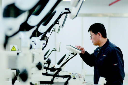 在推进数字强省建设过程中,我市立足数字产业发展需求布局,建设一批省级及以上创新中心、研究中心和高能级创新平台以“数”赋“智”,加快培育数字科技领军企业,推动产业数字化高质量发展。图为山东泽普医疗科技有限公司员工在调试智能康复器材。 李海涛摄